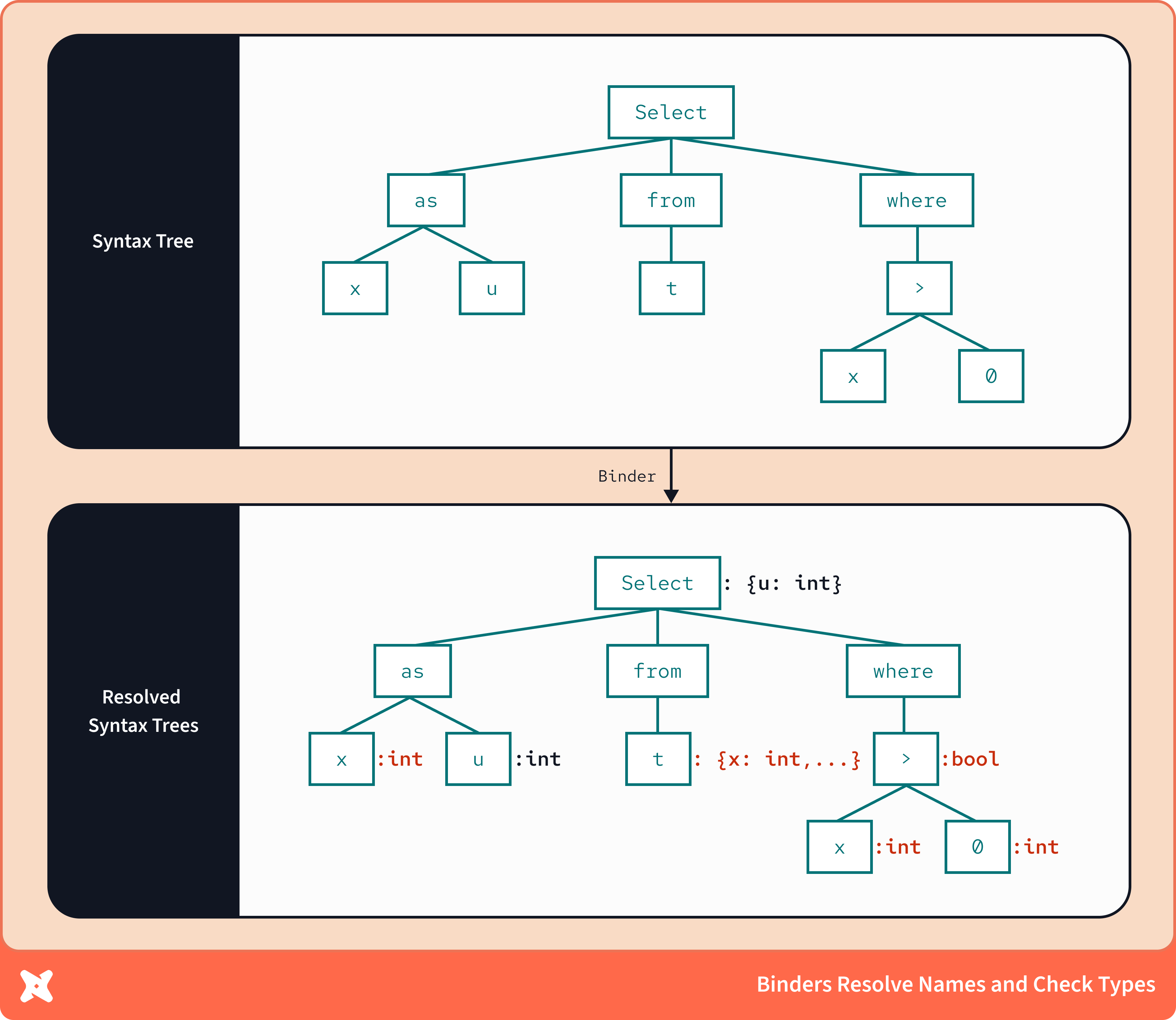 In the case of SQL binders, a major part of its job is to add warehouse schema information, like column datatypes, with the type signatures of warehouse operators described by the syntax tree to bring full type awareness to the syntax tree. It’s one thing to recognize a substring function in a query; it’s another to understand that a substring must operate on string data, and always produces string data, and will fail if you pass it an integer.
