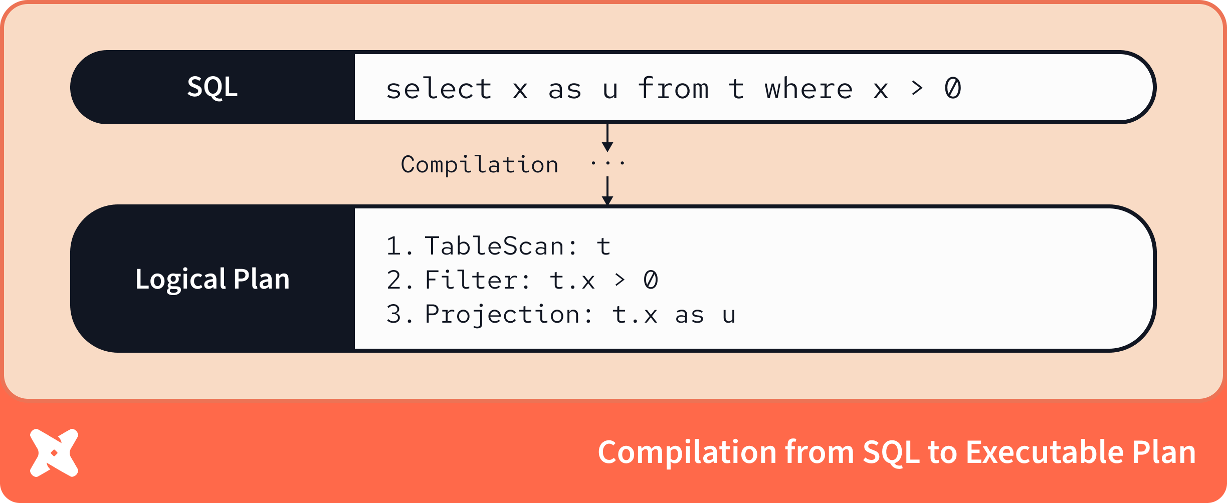 A compiler definitionally gives you a deeper understanding of the behavior of the query than a parser alone. We’re now able to trace the data flows and operations that we were abstractly expressing when we initially wrote our SQL query. The compiler incrementally enriches its understanding of the original SQL string and results in a logical plan, which provides static analysis and validation of your SQL logic.