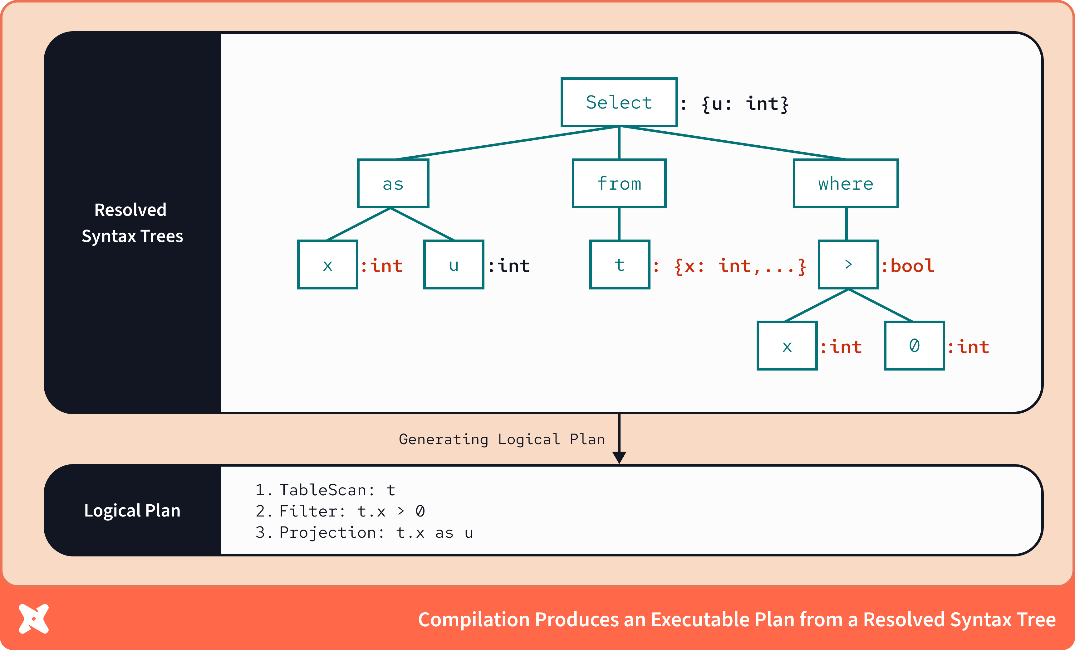 Second, database compilers bind metadata to the syntax tree to create a fully validated logical plan. This enables a complete understanding of the operations required to generate your dataset, including information about the datatypes that are input and output during SQL execution.