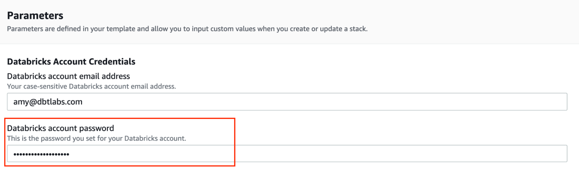 1. There is no need to change any of the pre-filled out fields in the Parameters. Just add in your Databricks password under Databricks Account Credentials. Check off the Acknowledgement and click Create stack.